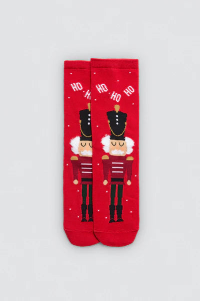 Stampe festive: simpatici soldatini Schiaccianoci e divertenti zampe di elfo su sfondo rosso, per portare magia nelle feste
