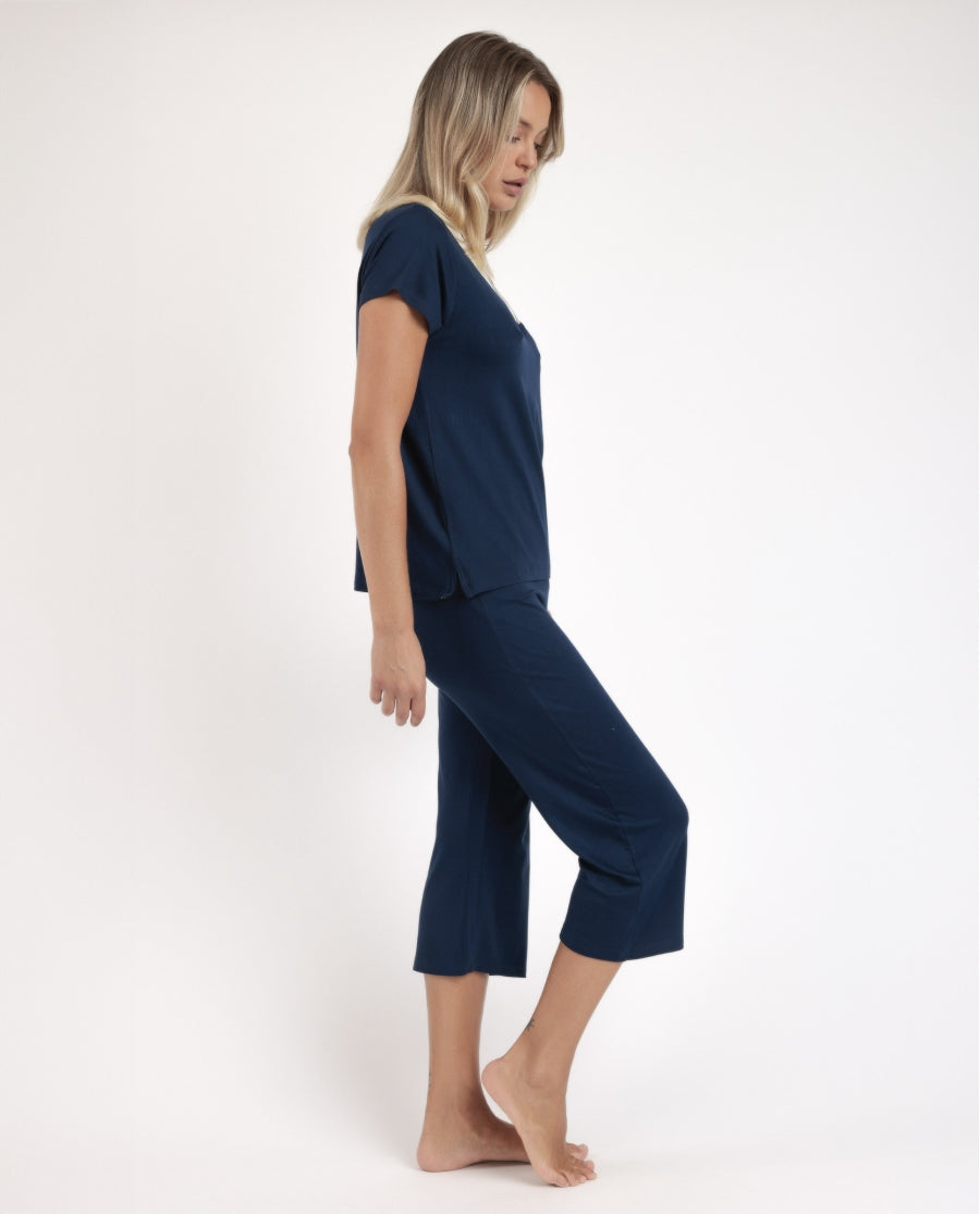 Pigiama da donna in morbida viscosa a maglia, con maniche corte, scollo a V e pantaloni palazzo per un comfort leggero e rilassato. La maglietta liscia e i pantaloni palazzo blu navy sono dotati di cintura regolabile, garantendo una vestibilità perfetta.