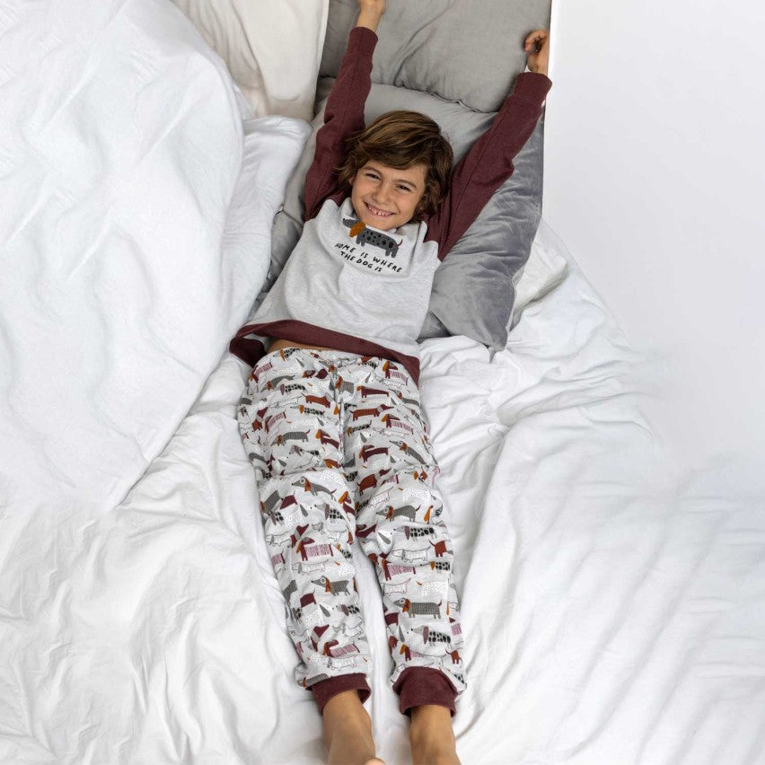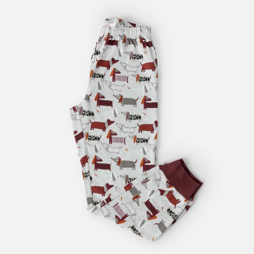 Il pantalone lungo abbinato è decorato con una fantasia all-over di piccoli bassotti in pose e tonalità diverse. Il fondo gamba elasticizzato, anch’esso a contrasto, assicura una vestibilità stabile e confortevole durante il riposo.