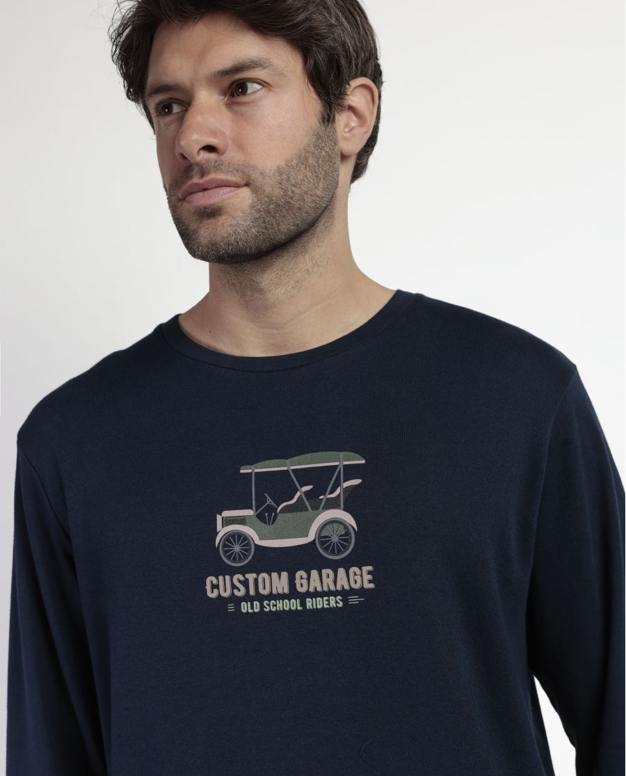 La parte superiore è una maglia a maniche lunghe con collo rotondo, proposta in un elegante blu navy. Il design è valorizzato da dettagli in rilievo che aggiungono un tocco moderno e distintivo, frutto di un progetto grafico personalizzato e originale del brand Admas.